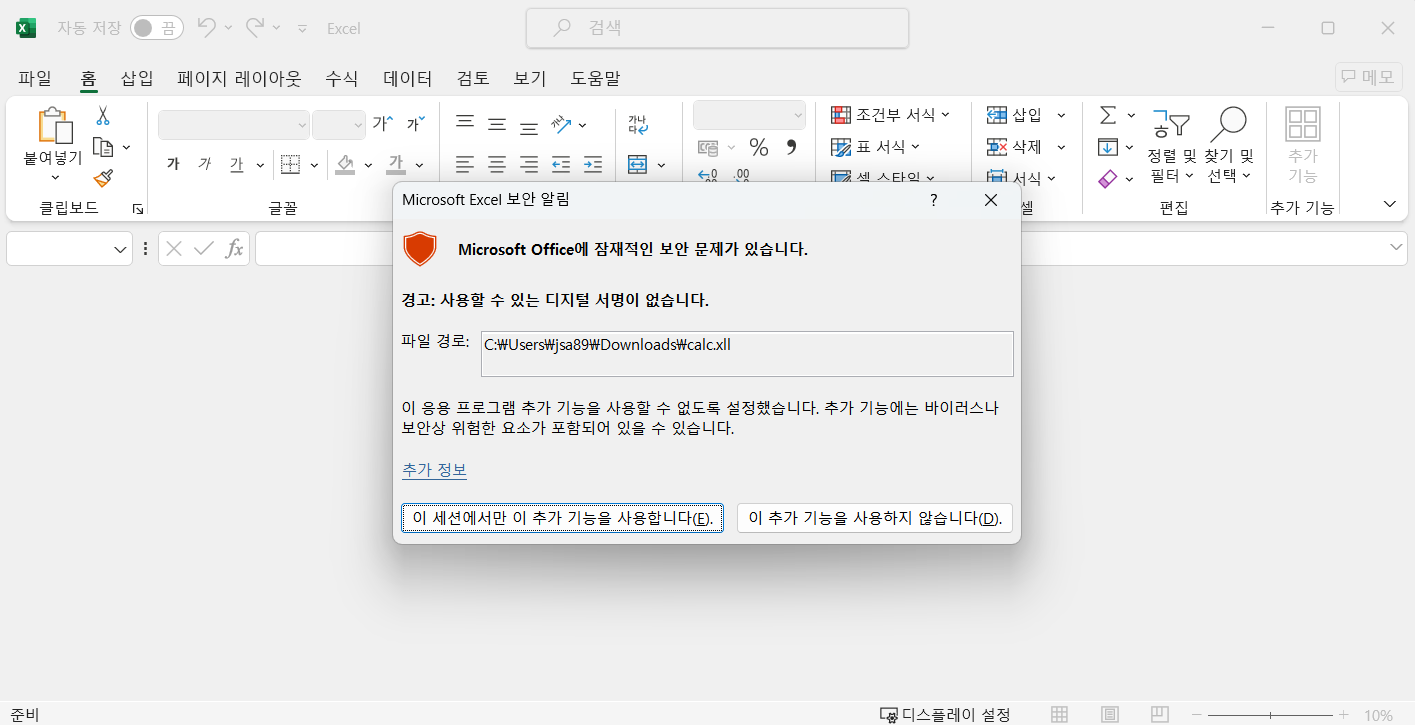 이후, 피해자가 해당 파일을 실행하고 추가 기능 사용을 허용하게 되면 추가적인 악성행위가 가능해지게 됩니다.